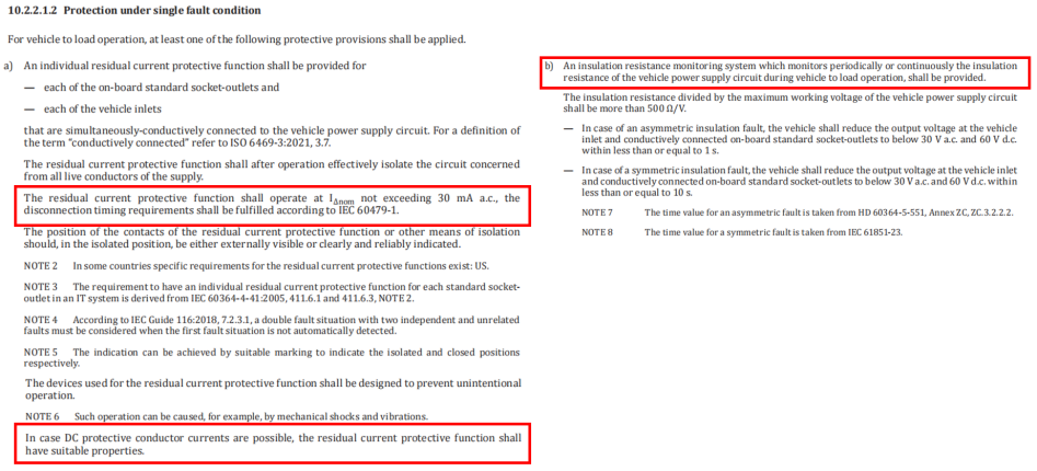 (a) A dedicated residual current protection (RCD) function shall be provided. Each onboard standard power socket or vehicle-side charging port requires independent leakage current protection.